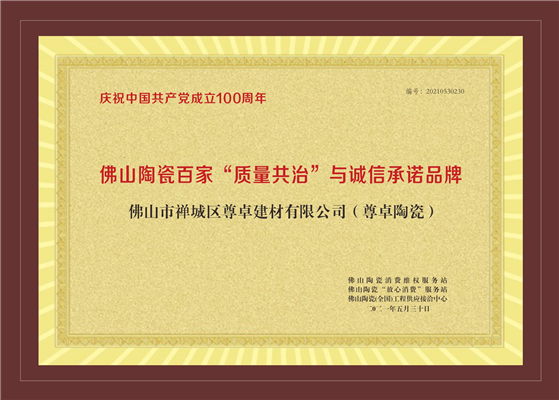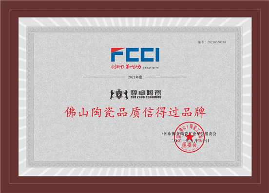 評選經過層層嚴選和深度挖掘,公正的準則極具行業權威性,尊卓陶瓷在眾多品牌角逐中脫穎而出,榮獲2021年度“佛山陶瓷十大品牌”“佛山陶瓷放心消費品牌”“佛山陶瓷品質信得過品牌”以及佛山陶瓷百家“質量共治”與誠信承諾品牌四項大獎。